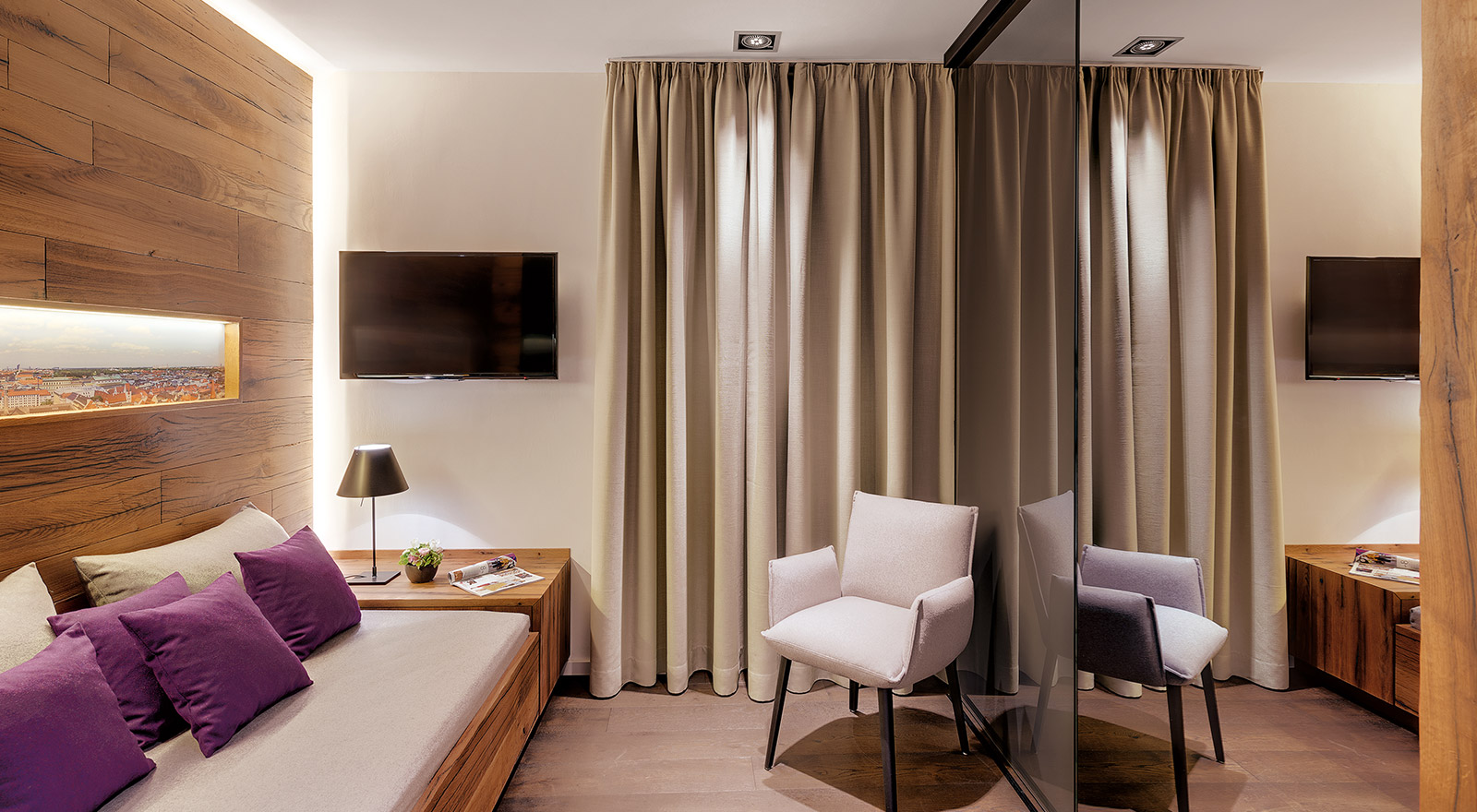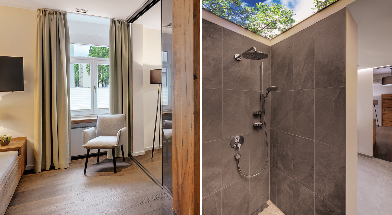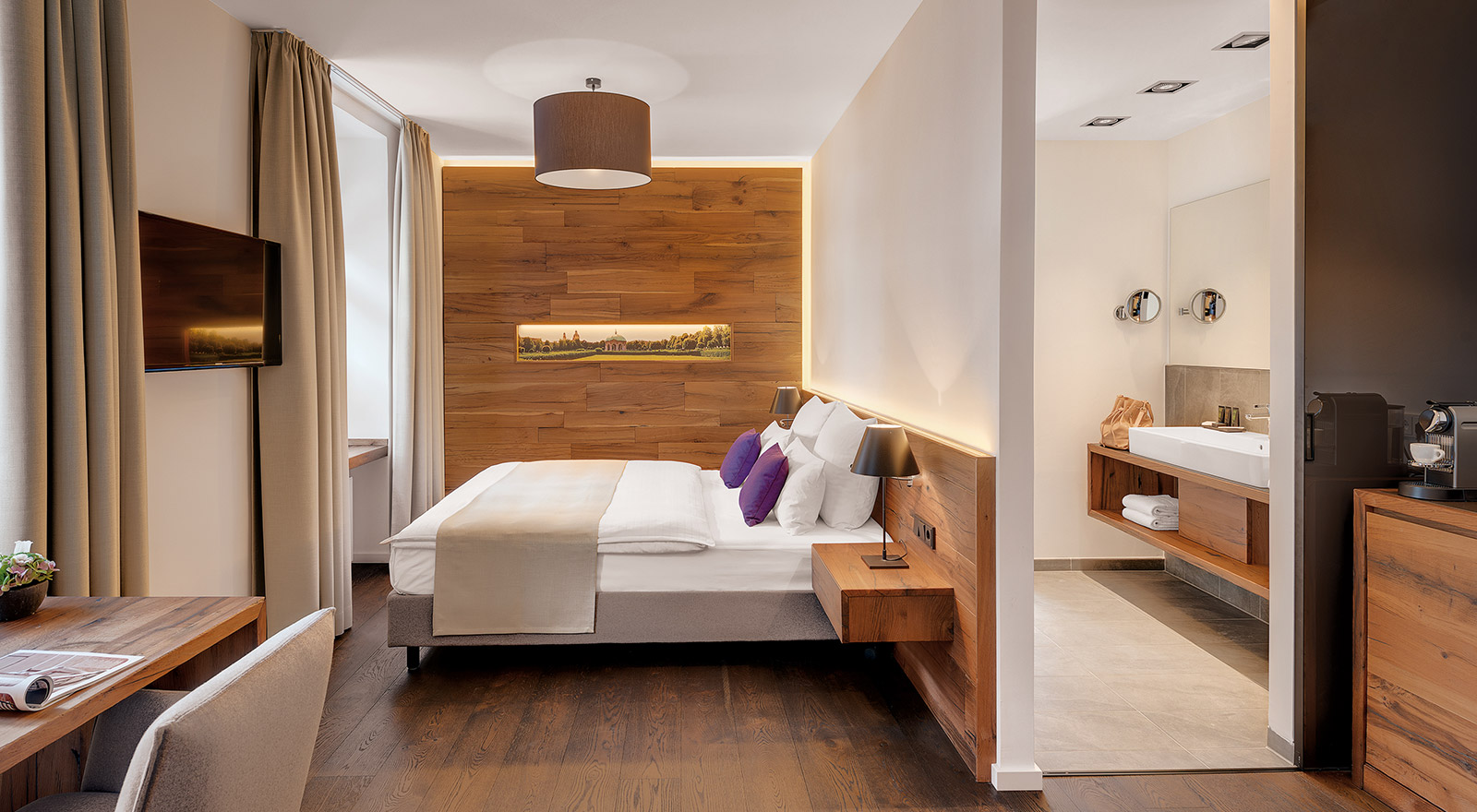 Das besondere Herzstück unseres Hauses ist unsere große Suite „Hofgarten“, bei deren Einrichtung wir viel Liebe in Detail und Nachhaltigkeit gelegt haben. Ein hochwertiger Massivholzboden und der Massage-Steinfußboden in der Wellness-Dusche mit Panorama-Decke tragen ebenso zu einem unvergesslichen Aufenthalt bei wie die durch Schiebetüren komplett abtrennbare Couch-Ecke mit Flat Screen TV und Lesebeleuchtung.