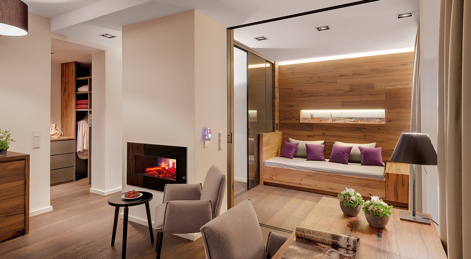 Höchste Komfortansprüche werden durch die individuell regulierbare Klimaanlage, dem begehbarem Kleiderschrank, schallisolierte Fenster, einem breiten Bett (180×210 cm) mit hochwertigen Bettwaren und ausgewählten Fair-Trade Pflegeprodukten in Bad und Dusche erfüllt. Für gemütliche Stunden sorgen neben dem elektrischen Kamin und der Smartphone-Dockingstation auch das Angebot an offenem Bio-Tee sowie einer Nespresso-Kaffeemaschine. Lassen Sie sich von diesem einzigartigen Charme verzaubern!